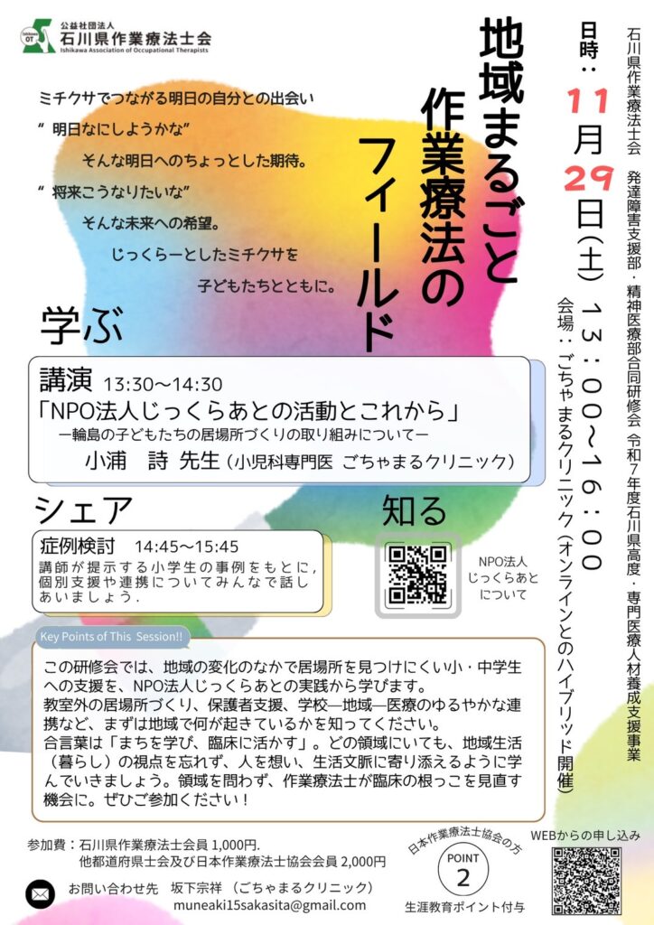内容輪島の子どもたちの居場所づくりの取り組みについて、ごちゃまるクリニックの小浦詩先生よりご講演いただき、私たち作業療法士が地域でできることを一緒に考えてみませんか?