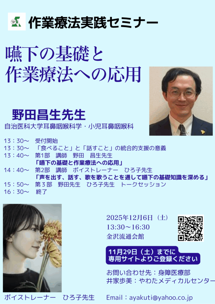 | 内容 | 第1部:「嚥下の基礎と作業療法への応用」 なぜ、嚥下機能が低下するのか。どのような仕組みで嚥下が起こっているのかなど基本的なところから、作業療法への応用まで紹介して頂きます。 講師 野田 昌生先生(自治医科大学耳鼻咽喉科学・小児耳鼻咽喉科) 第2部:「声を出す、話す、歌を歌うことを通して嚥下の基礎知識を深める」 講師 ボイストレーナー ひろ子先生 第3部:野田先生、ひろ子先生 トークセッション *令和7年度石川県高度・専門医療人材養成支援事業の助成を受けて実施します |