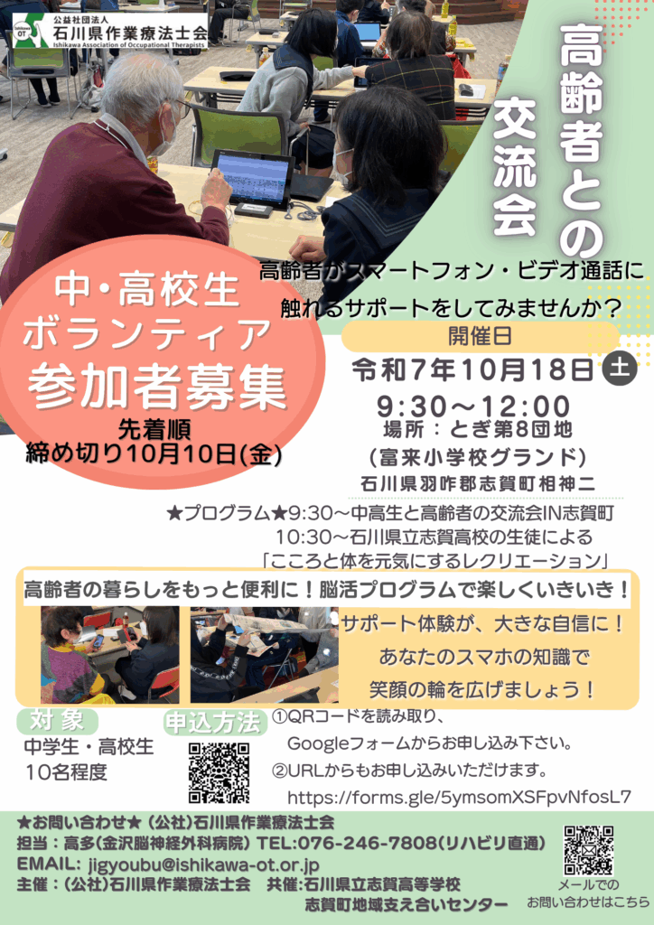 2025年10月18日 中高生と高齢者の交流会 in 志賀町 開催のお知らせ ( 2025年9月30日 )